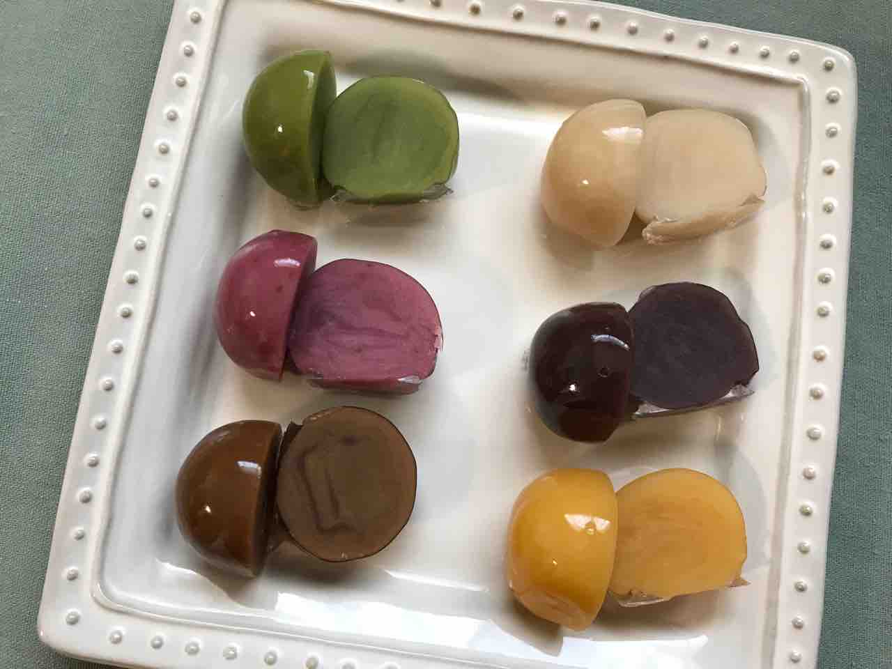 左上から時計回りに、抹茶・いんげん・小豆・みかん・珈琲・苺のラインナップ。